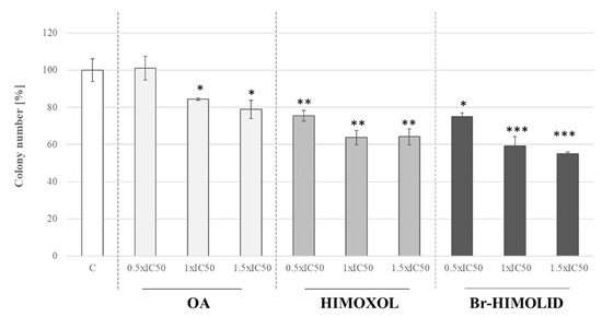 The clonogenic assay is an in vitro cell survival assay based on the ability of a single cell to form a colony [26]. It also reflects the genotoxic potential of compounds. In our study, OA, HIMOXOL, and Br-HIMOLID were applied to studied cells. In cells treated with the OA at 0.5× IC50, no significant alteration was reported, relative to control, untreated cells. When the cells were treated with OA at a concentration of 1× IC50 or 1.5× IC50 a significant decrease of colony-forming potential in SK-BR-3 cells was observed (around 20% in both cases, p < 0.05). Treatment of the cells with HIMOXOL or Br-HIMOLID provoked a significantly diminished clonogenic potential in all applied concentrations (0.5× IC50, 1× IC50, 1.5× IC50) up to around 40% in both cases (Figure 3; p < 0.05) in a dose-dependent manner (Figure 4).