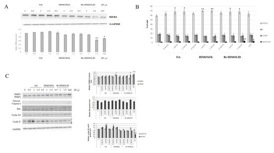 Since we decided to evaluate the influence of OA and OA-derivatives on HER2-positive cells that was supported by some literature premises, we performed immunoidentification of HER2 to verify any potential association between this receptor level and studied compounds. Treatment of the cells with OA or its derivatives (0.5× IC50, 1× IC50, or 1.5× IC50) revealed that only Br-HIMOLID significantly attenuated the accumulation of the target protein in studied cells (Figure 5A).