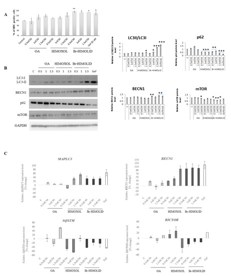 Assay with monodansylcadaverine revealed induction of autophagy in SK-BR-3 cells treated with OA and its both derivatives. Thus, to confirm this observation, a Western blot analysis was performed. The specific autophagy marker consists of LC3 protein and its isoforms ratio (LC3II/LC3I); the LC3-II isoform is associated with the autophagosome membrane. Analysis of this protein revealed that Br-HIMOLID in the concentration corresponding to 1× IC50 and 1.5× IC50 increased LC3-II/LC3-I ratio (up to 270% relative to control). Moreover, assessment of the positive regulator of autophagy, beclin-1 showed an increase in the level of this protein (up to 30% relative to control). Simultaneously, analysis of the next two proteins, negatively involved in autophagy activation, p62 (SQSTM) and mTOR, revealed a decreased level of both proteins (by 30% and 70%, respectively) and confirmed induction of autophagy induction in SK-BR-3 cells (Figure 6B). These observations were also confirmed at the mRNA level in qPCR analysis of respective genes. In cells treated with HIMOXOL in a concentration corresponding to 1× IC50 and 1.5× IC50 and in all concentration range of Br-HIMOLID we observed overexpression of MAPLC3 (LC3) and BECN1 (beclin1). However, the mRNA analysis of SQSTM (p62) revealed downregulation of this gene in cells treated with HIMOXOL in the concentration corresponding to 0.5× IC50 and 1× IC50 (up to 60%) and a significant decrease of this gene expression in cells treated with 0.5× IC50 of Br-HIMOLID (over 40%). Moreover, downregulation of RICTOR (mTOR) gene has been observed in cells treated with the highest applied concentration of HIMOXOL (1.5× IC50, 35%) and the lowest of Br-HIMOLID (0.5× IC50, 20%) (Figure 6C).