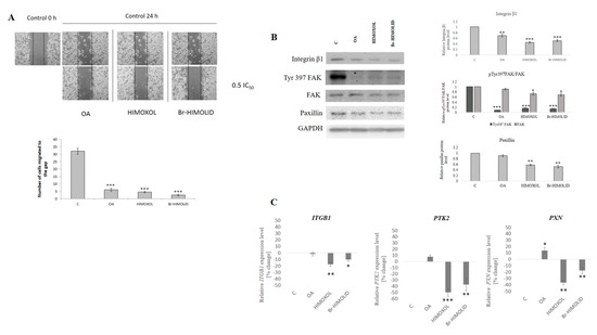 Assessment of the expression of genes contributing to migration-associated pathway revealed that treatment of studied cells for 24 h with HIMOXOL or Br-HIMOLID in applied sub-cytotoxic concentration, corresponding to 0.5× IC50 significantly decreased the expression of ITGB1 (up to 15–20%), PTK2 (up to 45%), and PXN (30% and 35%, respectively). When cells were treated with oleanolic acid, the expression status of ITGB1 and PTK2 was not significantly altered, however, the expression of paxillin (PXN) increased (by up to 30%).