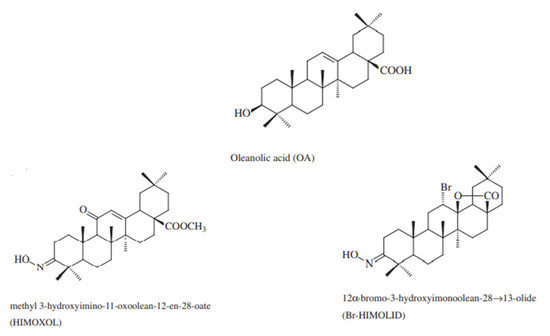Oleanolic acid was isolated from an industrial by-product obtained during the process of mistletoe herb essence production. Spectral data of the resulting chemicals were consistent with the data from the literature [63]. The semisynthetic OA derivatives, methyl 3-hydroxyimino-11-oxoolean-12-en-28-oate (HIMOXOL) and 12α-bromo-3-hydroxyimonoolean-28→13-olide (Br-HIMOLID) were synthesized as described in the earlier studies [64,65] at the Department of Organic Chemistry, Poznan University of Medical Sciences, Poland (Figure 8). Before use in the experiment, the derivatives were dissolved in DMSO and stored at 4 °C.