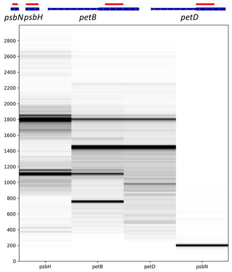Following transcription, transcripts from this multigenic locus are processed into multiple poly- or monocistronic isoforms on both genomic strands [30,31]. A rapid overview of the reads showed the transcription of psbN on the Crick strand while psbB, psbT, psbH, petB and petD were transcribed from the Watson strand as expected. The spliced petD and petB transcripts were also found. Taking advantage of long-read sequencing, it is possible to emulate Northern blots by selecting reads which map on specific positions and plotting the distribution of the read lengths. Felder et al. [30] studied the involvement of HCF107 in the processing of the psbB to petD locus with an extensive use of Northern blots, allowing a comparison of the two methods. We therefore generated virtual Northern blots for psbN, psbH, petB and petD (Figure 2) using virtual probes equivalent to the probes used for Figure 4C,E,H,I of Felder et al. [30].