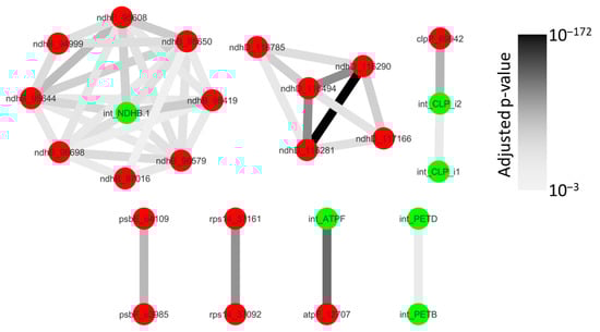 Network of splicing and editing coordination. Splicing events are shown in green and editing events in red. Dependent events are joined by an edge. The darkness of the edge is proportional to the adjusted p-value of the Exact Fisher test for the pool of the three replicates.