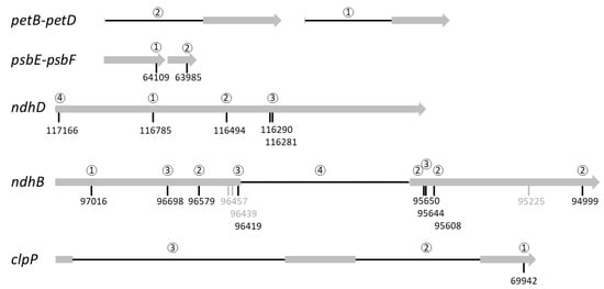 - Freyer, R.; Hoch, B.; Neckermann, K.; Maier, R.M.; Kössel, H. RNA editing in maize chloroplasts is a processing step independent of splicing and cleavage to monocistronic mRNAs. Plant J. 1993, 4, 621–629. [Google Scholar] [CrossRef] [PubMed]