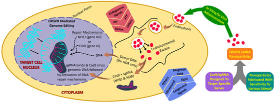 In the past several years, synthetic non-viral nanotechnology-based vectors were designed to increase the efficacy of CRISPR/Cas9 delivery into specific tissues. The key delivery property of NPs is the endosome escape process [7,8]. In addition, regulated and stimulus-based CRISPR/Cas9 delivery to specific cells or tissues has great potential to reduce the off-target effects in future therapeutic gene manipulation applications. In this regard, researchers developed stimulus-based smart NPs to improve the delivery effectiveness of CRISPR/Cas9 genome editing system. Previous reviews have summarized the CRISPR/Cas9 delivery strategies [9,10,11,12,13]. However, in this review, we discuss the cutting-edge smart NPs developed to solve the delivery issues of CRISPR technology at the cellular level (Figure 1) [14]. The smart NPs can be designed based on endogenous signals including pH, redox, and ATP and exogenous signals including radiations, magnetic field, and ultrasound waves to control or regulate the CRISPR/Cas9 delivery to specific cells in vivo. The controlled or regulated CRISPR/Cas9 delivery at a particular location and time in the cell has decreased the off-target effects in therapeutic gene editing. This review aims to summarize the current advances in gene editing delivery based on smart NPs and their future potential in the development of next generation therapeutic tools.