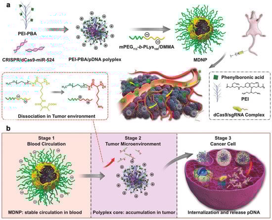 Schematic diagram of PEI/dCas9 to increase the gene expression of the miR524 gene as an anticancer therapy. (a) Preparation and delivery of MDNP. (b) MDNP delivery from blood circulation to the tumor cells. Reprinted with permission from ref [33]. Copyright 2018, Wiley-VCH.
