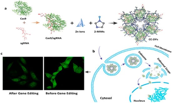 The gRNA/Cas9 complex assembled with the ZIF-8 metal–organic framework pores. The zif-8 was used to transfer CRISPR machinery to tumor cells efficiently. (a) Encapsulation of ZIF-8 nanoparticles. (b) Endosomal escape. (c) Image cell before and after treatment. Reprinted with permission from ref [35]. Copyright 2018, American Chemical Society.