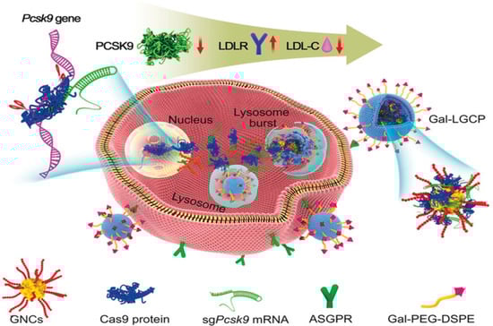 In the past, lipids have been widely used to deliver the mRNA and proteins to target cells for multiple purposes [36]. In one study, ionizable lipid smart NPs were used to deliver the CRISPR/Cas9 components specifically and efficiently to target cells with high uptake efficiency; ionizable particles such as PEI were used to ionize the head of lipid NPs, which increases the pH-responsive endosome escape property. The combination of pH-responsive lipid NPs and viral gene delivery method, adeno-associated viral vector (AVV) employed to correct the genetic mutation of tyrosinemia genetic hereditary disease through gene CRISPR/Cas9 knock-in strategy. The lipid NPs/AVV/sgRNA/Cas9 complex with homology arms to trigger HDR pathway delivered efficiently to mouse models to treat tyrosinemia disease. The gene mutation associated with tyrosinemia genetic hereditary disease was corrected efficiently up to 6% with less off-target effects in the mouse cells lines [37]. It has been discovered that the enzyme serine protease proprotein convertase subtilisin/kexin type 9 (PCSK9) is a key regulator and modulator of lipoprotein cholesterol (LDL-C). The Pcsk9 and LDL-C interaction causes a decrease in the clearance of LDL-C from the blood that ultimately leads to accumulation of LDL-C that causes coronary heart diseases. A triple target strategy was developed through the combination of gold nanoparticles modified with HIV-transactivating transcriptor (TAT) peptides, nuclear localization signal (NLS) tagged Cas9 protein to target the nucleus and targeted sgRNA (Figure 4). The combined complex of gRNA/Cas9/GNPs was encapsulated into galactose cationic lipid to target the glycoprotein receptors. That complex targets in the three modes, galactose targets the receptor protein on hepatocytes, TAT peptides and NLS target the nucleus and sgRNA/Cas9 complex delivered to liver cells to knock out and reduce the expression of Pcsk9 gene that decreases the 30% LDL-C in the blood with no detectable off-target effects [38,39,40,41].