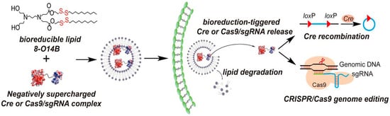 - Liu, J.; Chang, J.; Jiang, Y.; Meng, X.; Sun, T.; Mao, L.; Xu, Q.; Wang, M. Fast and efficient CRISPR/Cas9 genome editing in vivo enabled by bioreducible lipid and messenger RNA nanoparticles. Adv. Mater. 2019, 31, 1902575. [Google Scholar] [CrossRef]