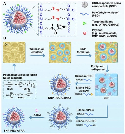 The glutathione (GSH) redox-responsive nanocapsules are also developed to edit the genome in vivo and in vitro. These types of nanocapsules were formed through the polymerization of acrylate units, which assembled themselves around the Cas9 RNP. Moreover, imidazole compounds containing the disulfide are attached to the RNP complex through H-bond linkage. This imidazole helps in endosomal escape delivery of the redox-responsive NPs. These types of bioreducible nanocapsules employed to deliver the sgRNA/RNP complex to a targeted cell in vitro and in vivo to edit retinal pigment and skeletal muscles genes, respectively [51,52,53]. Recently, GSH-responsive silica NPs (SNP) reported with high loading content and loading efficiency. Here, the silica network was integrated with disulfide cross linkers and an imidazole-containing component was also included in the NP infrastructure. While the disulfide crosslinks bestow the NP with GSH-responsive payload release ability when taken up by a target cell, the imidazole group improves endosome escape capacity. The in vivo studies established the NP’s ability to effectively deliver sgRNA /RNP (intravenous injection) and mRNA (subretinal injection) to hepatocytes and murine RPE cells when the NPs are functionalized with GalNAc and all-trans-retinoic acid (ATRA), respectively leading to efficient genome editing. Figure 6 shows a schematic representation of synthesizing GSH-responsive SNPs conjugated with different targeting ligands (Figure 6) [54].
