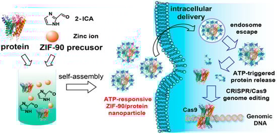 - Yang, X.; Tang, Q.; Jiang, Y.; Zhang, M.; Wang, M.; Mao, L. Nanoscale ATP-Responsive Zeolitic Imidazole Framework-90 as a General Platform for Cytosolic Protein Delivery and Genome Editing. J. Am. Chem. Soc. 2019, 141, 3782–3786. [Google Scholar] [CrossRef] [PubMed]