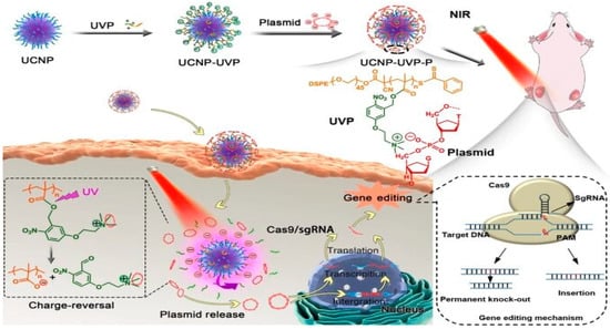 The upconversion nano-carriers (UCNP) has been created, which can convert infrared radiation into ultraviolet light, which payloads the CRISPR/Cas9 and gRNA gene-editing machinery to target cells [66]. This study was performed to target the PLK1 gene responsible for cancer progression. The gene editing through UNCP NPs has reduced the gene expression level up to 45% that has reduced the growth of the cancerous cells up to 35%. Researchers discovered that this strategy can be useful to treat cancer cells through CRISPR/Cas9 gene-editing machinery [67]. Moreover, a charge-reversal nano-vector was designed based on an ultraviolet-sensitive conjugated polyelectrolyte coated on an upconversion nanomaterial (UCNP-UVP-P). The cationic side-chains (polyethylene glycol, UVP) of the nano-vector are converted to anion chains upon UV emission by the UCNPs following 980 nm light irradiation. Under near-infrared (NIR) photoirradiation, the charge conversion released plasmids from the nano-vector with 90% efficiently. Again, the target gene in the study was the PLK1 gene, whose up-regulation as a result of mutations is implicated in a variety of cancers. UCNP-UVP-Cas9/sgPLK-1 was used to treat proliferating HepG2 cells followed by 980 nm laser irradiation (Figure 8). The experimental results showed that the strategy was able to site specifically knock out the target PLK1 and consequently down-regulate PLK1 expression as well as induce apoptosis of the tumor cells. The transfection efficiency of tumor cells was reported to be ~63 ± 4% [68].