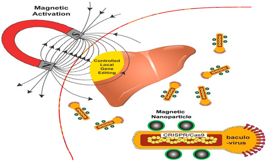 With the advent of CRISPR/Cas9, the issue of off-target genetic modification arose, which still remains a serious unsolved problem of this technique [69]. It is also difficult to modulate the systematic delivery and replication of viral vectors that increases the risk of off-target effects and genotoxicity [70]. Recently, researchers developed a magnetic field-responsive CRISPR delivery technique by combining baculoviral vectors and magnetic-based NPs, which can modulate the gene expression through transient deliver/activation of CRISPR system in vivo by exposure of magnetic field (on or off) with less off-target effects and high specificity. In this case, the delivery of the CRISPR machinery can be regulated by applying a magnetic field to edit specific sites of the genome in various cells and tissues of living organisms [71,72,73]. The baculoviral vector expresses the gene without entering into the host cell (Figure 9).