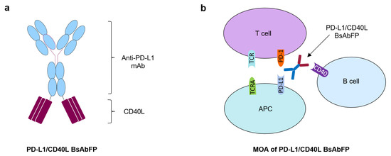 Figure 1. Structure illustration of anti-PD-L1/CD40L BsAbFP and potential mechanism of action. (a) Schematic representation of anti-PD-L1/CD40L BsAbFP consisting of anti-PD-L1 mAb and CD40L; (b) illustration of mechanism of action (MOA) of anti-PD-L1/CD40L BsAbFP that each arm binds to target antigens expressed on different cells, such as CD40-expressing B cells and PD-L1-expressing antigen presenting cells (APCs).