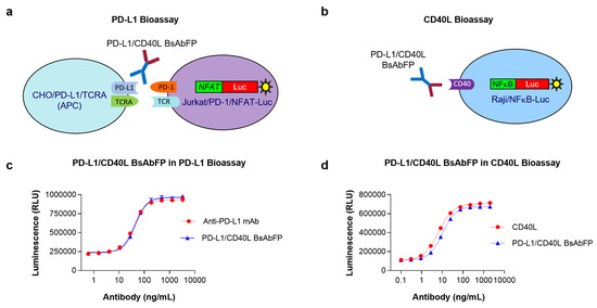 Figure 2. Assessment of each arm’s activity of anti-PD-L1/CD40L BsAbFP. (a) Illustration of PD-L1 bioassay: Anti-PD-L1 arm of anti-PD-L1/CD40L BsAbFP inhibits the PD-1/PD-L1 pathway leading to the activation of luciferase reporter gene in Jurkat/PD-1/NFAT-Luc cell; (b) Illustration of CD40L bioassay: CD40L arm of anti-PD-L1/CD40L BsAbFP binds to CD40 leading to the activation of luciferase reporter gene in Raji/NFκB-Luc cell; (c) Representative PD-L1 bioassay graph comparing dose-dependent response between of anti-PD-L1/CD40L BsAbFP and anti-PD-L1 mAb; (d) Representative CD40L bioassay graph comparing dose-dependent response between anti-PD-L1/CD40L BsAbFP and CD40L.