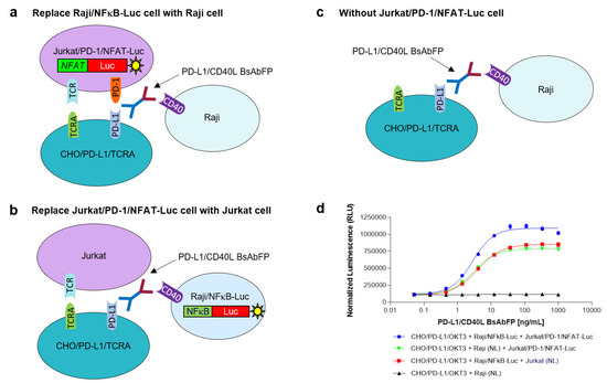 Figure 4. Characterization of PD-L1/CD40L dual target reporter bioassay. (a) Replacing Raji/NFκB-Luc cell with unmodified Raji cell (Raji/NL) that does not contain a luciferase reporter gene; (b) replacing Jurkat/PD-1/NFAT-Luc cell with unmodified Jurkat cell (Jurkat/NL) that does not contain a luciferase reporter or PD-1 gene; (c) use of unmodified Raji cell (Raji/NL) but without Jurkat/PD-1/NFAT-Luc cells; (d) summary of drug-response activity of anti-PD-L1/CD40L BsAbFP. The assay was performed using a 1:3 serial dilution of anti-PD-L1/CD40L BsAbFP with a starting concentration of 1000 ng/mL.