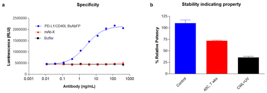 Figure 5. Specificity and stability indicating property assessment for the dual target reporter bioassay. (a) Specificity of the dual target reporter bioassay was assessed by testing the potency of anti-PD-L1/CD40L BsAbFP (blue), non-specific IgG (mAb-X, red) and formulation buffer (black). The dose-response data obtained were analyzed with a 4PL curve fit; (b) anti-PD-L1/CD40L BsAbFP samples were forced degraded with heat-stress (7 weeks at 40 °C) or UV light and assessed for potency using the dual target reporter bioassay. The results showed that dual target reporter bioassay is specific and can detect the changes in potency of forced degradation anti-PD-L1/CD40L BsAbFP samples. The assay was performed using a 1:3.2 serial dilution of anti-PD-L1/CD40L BsAbFP with a starting concentration of 400 ng/mL.