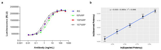 Figure 6. Linearity of dual target reporter gene bioassay for anti-PD-L1/CD40L BsAbFP. (a) Representative linearity curve fit at 60%, 100% and 167% relative potency of anti-PD-L1/CD40L BsAbFP; (b) a linear regression assessment for 60–167% relative potency samples from replicate runs (n = 6). Error bars indicate ± SD. The assay uses a 1:3.2 serial dilution of anti-PD-L1/CD40L BsAbFP with a starting concentration of 400 ng/mL.