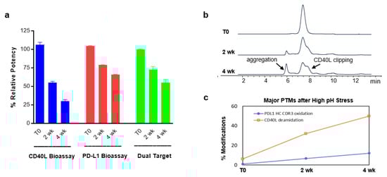 Figure 7. Evaluation of Structure-Function Attributes of Anti-PD-L1/CD40L BsAbFP. Potency attribute, molecular integrity, and post-translational modification (PTM) of anti-PD-L1/CD40L BsAbFP after high pH (pH = 8.5) stress were assessed using (a) CD40L bioassay, PD-L1 bioassay, and PD-L1/CD40L dual target reporter bioassay (Dual Target); (b) size exclusion chromatography (SEC) and (c) peptide mapping for PTM measurements of T0, 2 wk and 4 wk samples.