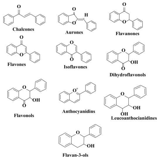 Cytotoxic drugs are classified, according to their mechanism of action, into alkylating agents, heavy metals (platinum), antimetabolites, cytotoxic antibiotics, and cell cycle blockers. Most cytotoxic compounds act on the integrity of DNA and cell division in cancer cells [21]. Clinical use of platinum complexes as an adjunct in anticancer therapy is based on their ability to cause tumor cell death, as these compounds have a wide range of activities [22]. Reasons for the ineffectiveness of anticancer therapies are metastases, recurrences, heterogeneity, resistance to chemotherapy and radiation, and a decreased immune system capacity. All of these therapeutic failures can be explained by the characteristics of cancer stem cells [23,24,25]. Mesenchymal stem cells are a type of cell commonly used in regenerative medicine. These cells are known to exert suppressive effects on cancer cells [26]. Resistance to therapy continues to be the main limiting factor in the treatment of cancer patients. Current standard therapies (surgery, chemotherapy, and radiotherapy) are deficient due to adverse and toxic effects, patient intolerance, and a low long-term survival rate [27,28,29,30]. Surgical therapy and radiation therapy aim to eradicate localized cancers, and advanced stages of the disease can be controlled only by chemotherapy [31]. In the transport process of a biologically active compound, its diffusion may produce nonspecific interactions, which will lead to a decrease in efficiency and adverse reactions [32]. Among the anticancer therapies, targeted therapies are the most effective because they have a low number of side effects, good viability, low doses are administered, and therapeutic resistance is more difficult to install [33]. For example, nanomedicine is successfully used as a vehicle for the targeted transport of immunostimulatory agents to facilitate an antitumor immune response. Numerous strategies have been investigated to reduce the toxicity of anticancer immunotherapy. Nano-formulations of antigens, cytokines, chemokines, nucleotides, and Toll-like receptor agonists showed favorable results [34]. At present, the identification of new alternative therapeutic agents, which are more effective and have less toxic effects, is attracting growing interest. This goal is challenging to achieve due to the complexity of tumor formations [35]. Monoclonal antibodies and chemoprevention by natural compounds are two important directions for the treatment and prevention of cancer [36]. One of the essential strategies in this regard is the use of biologically active phytochemicals, as they have low toxicity and pleiotropic effects in various cellular processes that interfere with the onset and progression of cancer. Interference with carcinogenesis through the diet or supplementation with natural compounds is called chemoprevention [37,38,39,40,41]. Over 3000 plant compounds with anticancer properties have been identified [42]. Among these compounds, flavonoids have numerous representatives with cytotoxic properties on many types of human cancer cells and are absent of or have diminished adverse effects on normal cells [43]. Flavonoids are polyphenolic compounds and represent a class of biologically active secondary metabolites in plants with a basic structure of diphenylpropane (C6-C3-C6) and that have a low molecular weight. They are biosynthesized from phenylpropanoid and chalcones are the first flavonoids to be formed [44,45,46,47,48,49,50,51]. The common precursor of flavonoids is phenylalanine, and calcium synthetase, calcium isomerase, and flavan 3 hydrolase are considered key enzymes for their biosynthesis [52,53,54,55,56]. For many flavonoids, a bridge forms a pyranic or pyronic ring [57]. Depending on the basic structure, these compounds are classified into chalcones, aurones, flavanones, flavones, isoflavones, dihydroflavonols, flavonols, leucoanthocyanidins, anthocyanidins, and flavan-3-ols (Figure 1) [58,59,60,61].