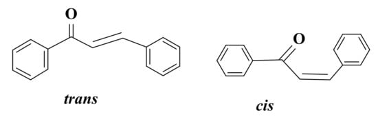 α, β-unsaturated carbonyl group is a good Michael acceptor and participates in nucleophilic additions [105]. Chalcones are found in two isomeric forms (cis and trans), the trans form being more thermodynamically stable and, implicitly, the predominant configuration for these compounds (Figure 3) [106,107,108].