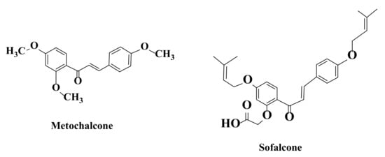 Due to their flexible structure, chalcones can effectively bind to many enzymes and receptors, which explains the many biological applications of these compounds [117]. Another explanation for pharmacological activities of these compounds is conjugation between double bond and carbonyl group present in structure [118]. Bioactivities of chalcones are dependent on the position, number, and nature of substituents on the two aromatic residues (aldehyde and acetophenone). Data from literature show that a huge number of natural and synthetic chalcones have been identified with clinical and pharmaceutical applications, these compounds having anticancer, antibacterial, antiviral, antipyretic, antihypertensive anti-Alzheimer’s, anti-inflammatory, anti-HIV, antioxidant, antiulcer, estrogenic, and neuroprotective activities. Chalcones have ability to inhibit α-glucosidase, MAO-B (monoamine oxidase), tubulin, and tyrosine kinase [118,119,120,121,122,123,124,125,126,127,128,129,130,131,132,133,134,135,136,137]. On the other hand, chalcones, under certain conditions, have oxidizing properties. This effect may be associated with antitumor activity of these compounds and is based on mechanisms such as increased superoxide formation, cellular glutathione depletion, and phenoxide radical generation. Additionally, available studies have demonstrated targeted activity of chalcones on numerous kinases, microtubules, polytherapy-resistant proteins, and various signaling pathways associated with cell survival and death [138]. Interesting structure of these compounds and various biological activities have led to approval of new drugs from chalcone class, such as metochalcone (an anticoleretic drug) and sofalcone (an antiulcer drug) (Figure 5) [139,140].