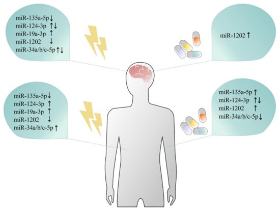 - Fang, Y.; Qiu, Q.; Zhang, S.; Sun, L.; Li, G.; Xiao, S.; Li, X. Changes in MiRNA-132 and MiR-124 Levels in Non-Treated and Citalopram-Treated Patients with Depression. J. Affect. Disord. 2018, 227, 745–751. [Google Scholar] [CrossRef]