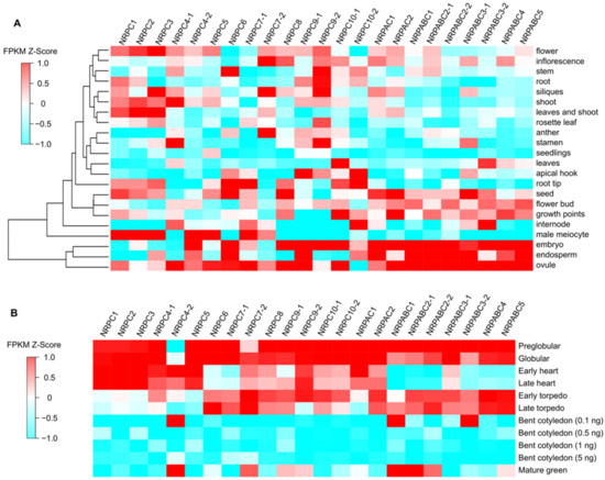 The expression patterns of different RNAPIII subunits in Arabidopsis were investigated by analyzing the transcripts using publicly available transcriptome sequencing (RNA-seq) data [24]. The subunits genes, NRPABC1, NRPABC2, NRPABC3, NRPABC4, and NRPABC5, exhibited high-level expression in different seed tissues, including embryos, endosperm and ovules at the pre-globular, globular, early torpedo, and late torpedo stages, whereas NRPABC1 and NRPABC2 had a higher expression level in the mature green seed (Figure 1). Subunits genes NRPAC1 and NRPAC2 were expressed in seeds, and their expression levels steadily decreased advancing seed growth. NRPC1, NRPC2, and NRPC3 were highly expressed in the male meiocyte, flower, leaf and shoot, and those subunits were highly expressed at the early development stage of seed development (Figure 1). NRPC4 was encoded by two gene paralogs with different expression patterns in different tissues and at different stages of seed development. NRPC4-1 was highly expressed in the shoot, stamen, and ovule, but NRPC4-2 was abundantly expressed in male meiocytes and embryos (Figure 1). The expression of NRPC4-1 decreased steadily with advancing seed growth, whereas NRPC4-2 was expressed at a high level in the early heart, bent cotyledon (0.1 ng), and mature green seed stages. NRPC5 was expressed at a high level in male meiocytes and ovules and was detected during the early stages of seed development. NRPC6 was detected in stem, root tip, and seed tissues, including embryos, endosperm, and ovules, with high expression levels at the pre-globular, globular, and torpedo stages of seed development (Figure 1). NRPC7-1 and NRPC7-2 had different expression patterns. NRPC7-1 was strongly expressed in male meiocytes, root tips, and ovules, while NRPC7-2 was detected in inflorescence, siliques, and anthers. NRPC7-1 was expressed at the pre-globular, globular stages; however, the expression level of NRPC7-2 first increased, and then decreased, during seed development (Figure 1). NRPC8 was specifically expressed in seed organs, including the embryo and ovule, and the expression level decreased during seed development (Figure 1). NRPC9-1 was expressed in the apical hook, embryo, endosperm, and ovule, but NRPC9-2 was expressed more ubiquitously, including in stem, root, siliques, stamen, and embryo tissues. NRPC9-1 and NRPC9-2 were expressed at the early stages of seed development (Figure 1). NRPC10-1 exhibited high expression in leaves, growth points, embryos, and ovules, but NRPC10-2 was detected in the apical hook, root tip, internode, and endosperm; NRPC10-1 and NRPC10-2 were expressed early in seed development (Figure 1).