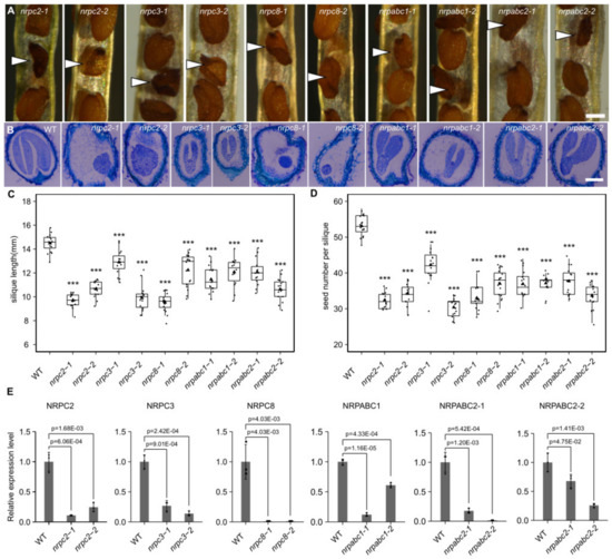 The relative expression level of NRPC8 was notably reduced in nrpc8-1 and nrpc8-2 (Figure 2E). The mutant embryos arrested at the preglobular stage (Figure 2B and Figure S1) and mature grain had only the seed coat (Figure 2A). The silique average length of nrpc8-1 and nrpc8-2 was reduced by approximately 34% and 15% compared to wild-type (Figure 2C), and the seed number per silique was reduced by approximately 38% and 30%, respectively (Figure 2D).