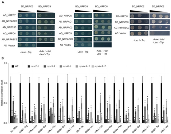 With 17 subunits, RNAPIII is the largest of the three RNA polymerases. It comprises the conserved 10-subunit core, a 2-subunit peripheral stalk (NRPC8-NRPC9), an NRPC4-NRPC5 heterodimer, and the NRPC3–NRPC6–NRPC7 heterotrimer [4,25]. To further investigate the nature of these subcomplexes, we applied a yeast-two-hybrid (Y2H) analysis to screen for the relationships between different subunits. We found that NRPC2 physically interacts with other subunits of the RNAPIII complex, including NRPC8, NRPC10, and NRPABC3. Meanwhile, NRPC7, NRPC10, NRPC4, NRPABC3, and NRPABC5 were confirmed to participate in a protein–protein interaction with NRPC3, and NRPC8 physically interacted with NRPC6, NRPC9, NRPAC1, NRPAC2, and NRPABC2 (Figure 3A). Together these results show that NRPC2, NRPC3, NRPC8, and NRPABC2 all interact with other subunits of the RNAPIII complex.