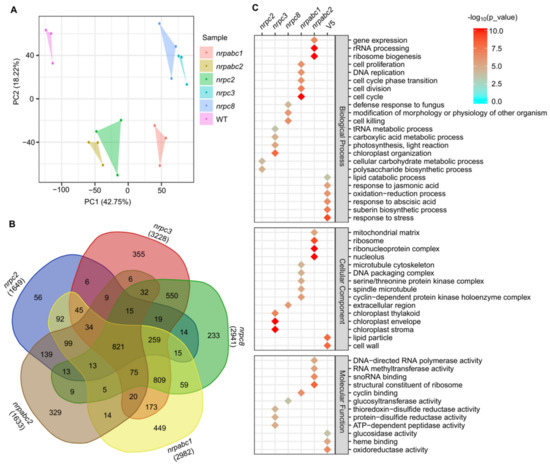 To explore the molecular basis of how these different RNAPIII subunits regulate seed development in Arabidopsis as described above, we performed RNA-seq to generate transcriptome profiles. We sampled Arabidopsis seeds at 10 DAF from nrpc2-1, nrpc3-2, nrpc8-1, nrpabc1-1, nrpabc2-2, and wild-type lines (three biological replicates from each genotype). Principal component analysis (PCA) revealed that the six samples could be clearly assigned to four groups (wild-type; nrpabc1; nrpc2; nrpabc2; nrpc3; and nrpc8), and transcriptome characteristics were highly correlated between different biological replicates of each genotype sample (Figure 4A). We identified 1649 DEGs (p-value < 0.01 and abs(log2(Fold-Change) > 1) between nrpc2 and the wild-type; the number of DEGs between nrpc3 and the wild-type was 3228, almost twice as much as nrpc2 between nrpc2 and the wild-type. Compared to the wild-type, 2941, 2982, and 1633 genes were significantly differentially expressed in nrpc8, nrpabc1, and nrpabc2. We found 821 common DEGs in all five genotypes of mutant seeds and 56, 355, 233, 449, and 329 unique DEGs in nrpc2, nrpc3, nrpc8, nrpabc1, and nrpabc2 seeds, respectively (Figure 4B).