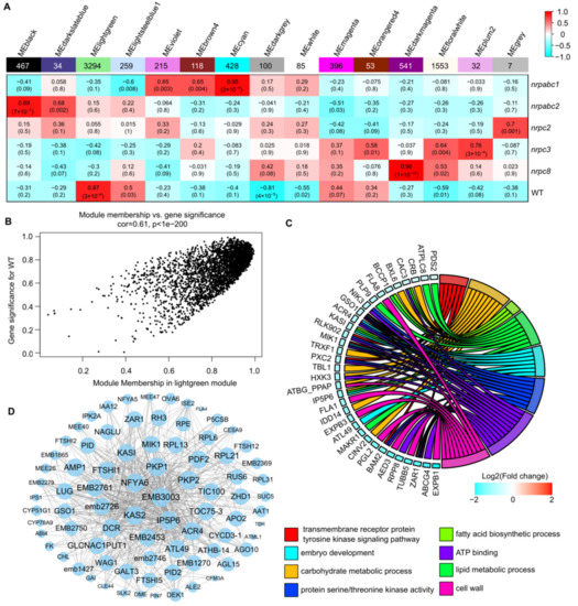 WGCNA of the transcripts in wild-type and different subunit knockdown lines. (A) Association between modules and traits. The legend indicates the correlation. Each cell shows the number of corresponding correlations and the p-values. (B) Module membership versus gene significance in the MElightgreen module. (C) GO classification of hub genes in the MElightgreen module. (D) Network analysis of the proteins related to seed development or embryo development in the MElightgreen module.