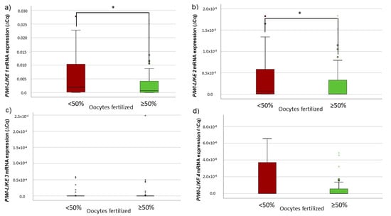 Association between fertilization success and (a) PIWI-LIKE 1, (b) PIWI-LIKE 2, (c) PIWI-LIKE 3, or (d) PIWI-LIKE 4 spermatozoal mRNA levels in 160 ART cycles. * p < 0.05.