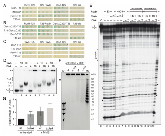 In vivo protein–protein interaction was assayed using the bacterial adenylate cyclase-based two-hybrid (BACTH) technique as described [24]. The plasmid-borne DisA (or DisA ΔC290 (which lacks the C-terminal 70 residues)) fusions to the T18 or T25 catalytic domain of the Bordetella adenylate cyclase, either at the N- (DisA-T18 and DisA-T25) or C-terminus (T18-DisA or T25-DisA), were pairwise co-transformed into the reporter BTH101 strain with plasmid-borne RuvA, RuvB, or RecU fusions, also to the T18 or T25 catalytic domain, either at the N- or the C-terminus. The empty vectors or the pKT25-Zip and pUT18C-Zip vectors were co-transformed into the reporter strain as negative and positive controls, respectively. Serial dilutions were spotted onto LB plates supplemented with ampicillin, kanamycin, streptomycin, 0.5 mM IPTG, and 10% X-Gal. The plates were then incubated at 25 °C for 3–4 days and photographed. Each co-transformation was performed at least in triplicate and a representative result is shown.