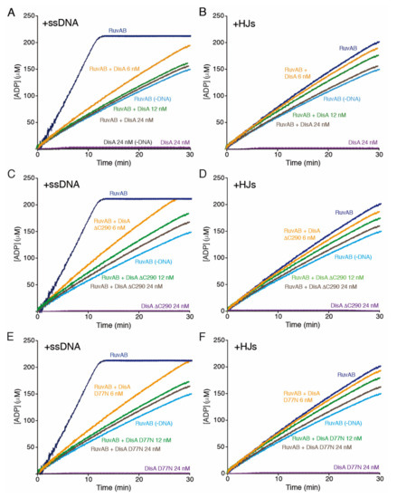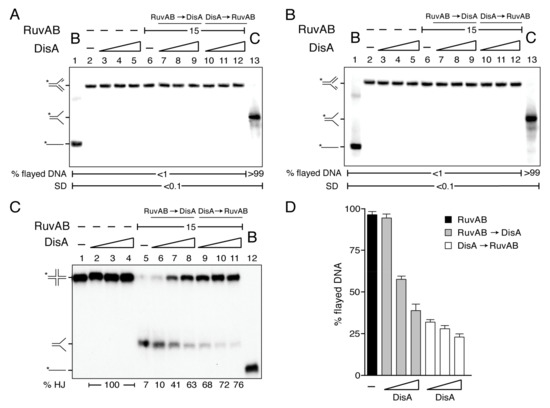 2.6. DisA Bound to HJ DNA Inhibits RuvAB-Mediated Fork Restoration