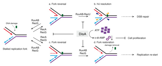 Proposed DisA mode of action in the presence of RecU and RuvAB. An unrepaired DNA lesion on the leading-strand template (green square) causes blockage of replication fork movement. Fork reversal by the RecA or RecG remodeler may form an HJ DNA structure and this process is inhibited by DisA. In the upper panel, DisA suppresses fork reversal and HJ resolution by the RuvAB-RecU resolvasome (a,b), avoiding the formation of a one-ended DSB. In the lower panel, DNA synthesis extends the regressed fork to convert it into an HJ-like structure, and fork restoration is catalyzed either by RuvAB or RecG (c,d), followed by damage removal by specific repair mechanisms. This process is also downregulated by DisA. DisA bound to HJ DNA decreases c-di-AMP synthesis, indirectly increasing (p)ppGpp synthesis and inhibiting cell proliferation.
