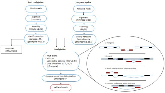 - Cabili, M.N.; Trapnell, C.; Goff, L.; Koziol, M.; Tazon-Vega, B.; Regev, A.; Rinn, J.L. Integrative annotation of human large intergenic noncoding RNAs reveals global properties and specific subclasses. Genes Dev. 2011, 25, 1915–1927. [Google Scholar] [CrossRef] [Green Version]