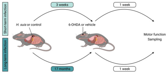 Importantly, there are some limitations to the current study. The 6-OHDA mouse model induces acute and pronounced dopaminergic neurodegeneration which contrasts with the slowly progressive disease in humans. In addition, the importance of oxidative stress could be magnified in this mouse model due to the inherent oxidative mechanism of action of 6-OHDA. In our current experiments, we sampled one week after 6-OHDA injection. It could be interesting to see what the effects of H. suis infection are in the long-term after dopaminergic cell loss. To conclude, the moment of H. suis infection could also be important, namely before or after the onset of disease, and could have different effects on disease progression or symptoms accordingly.
