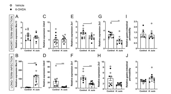 Gastric Helicobacter suis (H. suis) infection is associated with a limited decrease in integrity of the gastrointestinal barrier. (A,B) Relative mRNA gene expression of the mucin Muc13 in the corpus of the stomach of mice infected with H. suis or the control broth for a short- (n = 8–10) (A) or long-term period (n = 7–10) (B), 7 days after intrastriatal injection with either 6-OHDA (black) or vehicle (white). (C–H) Relative expression of the tight junction genes claudin 5 (Cldn5) (C,D), zonula occludens 1 (Zo1) (E,F), and zonula occludens 3 (Zo3) (G,H) in the corpus of the stomach of mice infected with H. suis or the control broth for a short- (n = 9–11) (C,E,G) or long-term period (n = 8–10) (D,F,H). (I,J) Relative gastrointestinal permeability based on the 4 kDa FITC-dextran leakage assay of control mice compared to mice infected with H. suis for a short- (n = 8–9) (I) or long-term period (n = 9–10) (J). Data were analyzed by the Mann–Whitney test. * 0.01 ≤ p < 0.05; ** 0.001 ≤ p < 0.01; *** 0.0001 ≤ p < 0.001.