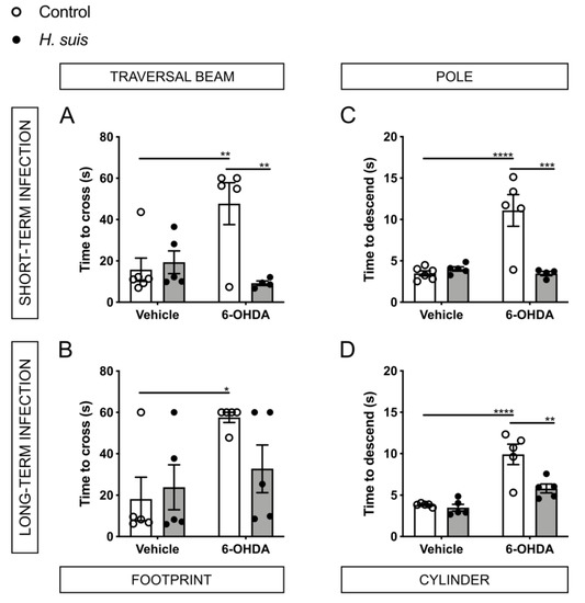Similarly, in the pole test of both groups at 7 dpi (Figure 4C,D), the control/6-OHDA subgroups needed more time to descend the pole compared to the other three subgroups, which was significant between the control/vehicle and control/6-OHDA subgroups and the H. suis/6-OHDA and control/6-OHDA subgroups.