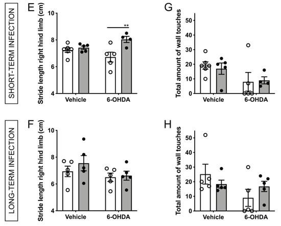 PD patients tend to show a shuffling gait pattern with a shortened stride length [45]. Therefore, the stride length of the mice was analyzed using the footprint analysis (Figure 4E,F). The short-term group showed a significantly shorter stride length of the control/6-OHDA subgroup compared to the H. suis/6-OHDA subgroup. For the long-term group, the stride length of both the control/6-OHDA and H. suis/6-OHDA subgroups were shorter compared to the other subgroups as well, albeit not significantly.