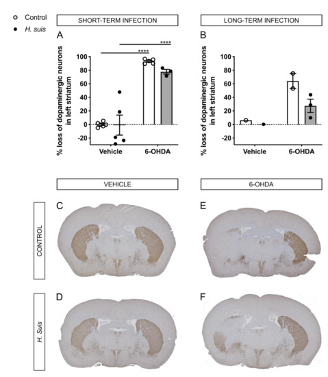 Via TH-immunochemistry, the dopaminergic neuron fiber density was visualized in brain sections containing the striatum. The TH signal (% brown staining) of the right, non-injected striatum was set at 100% (i.e., no loss of dopaminergic neurons), and the TH signal in the left, injected striatum was then calculated with the conversion factor. For the short-term group, the mean % loss of dopaminergic neuron fiber density in the left striatum compared to the right striatum was 93.17% for the control/6-OHDA subgroup, and 77.78% for the H. suis/6-OHDA subgroup (Figure 5A). As expected, no loss was demonstrated in both vehicle-injected subgroups. For the long-term group, fewer data was available due to insufficient quality of brain slices usable for TH staining. Still, based on the available data, the mean % loss of dopaminergic neuron fiber density in the left striatum compared to the right striatum was 64.16% for the control/6-OHDA subgroup, and 27.49% for the H. suis/6-OHDA subgroup (Figure 5B). In Figure 5C–F, representative images for TH staining of all subgroups are shown.