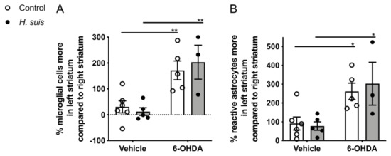 2.5. 6-OHDA-Induced Gliosis Is not Influenced by H. suis Infection