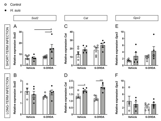 Concerning the endogenous peroxidases, superoxide dismutases (Sod1 and Sod2) convert superoxide radicals to form H2O2, which is subsequently detoxified by catalase (Cat) and glutathione peroxidase (Gpx1 and Gpx2) [51]. The expression levels of Sod2 showed a significant increase for the 6-OHDA-injected H. suis short-term infected group with a similar trend in the long-term group (Figure 7A,B), no significant changes were seen for Sod1 (Supplementary Figure S4A,B). Mice that were infected long-term with H. suis showed a significant increase in expression of Cat, both for vehicle-injected mice and 6-OHDA-injected mice (Figure 7D). This trend for increased Cat expression, although not significant, was also seen in mice with a H. suis short-term infection (Figure 7C). When comparing the 6-OHDA-injected groups, there was no significant difference for Gpx1 (Supplementary Figure S4C,D) and Gpx2 (Figure 7E,F) between H. suis-infected mice and controls, albeit there is a trend towards the same differences seen for Sod2 and Cat.