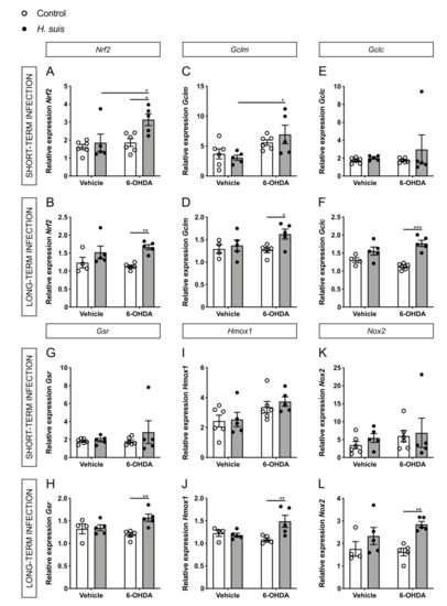 Fitting with our hypothesis for 6-OHDA-injected mice, the expression levels of Nrf2 were significantly increased in the H. suis-infected mice compared to controls, both in the short- and long-term infected groups (Figure 8A,B). Transcriptional activation of Nrf2 promotes cellular defense mechanisms through downstream regulators such as heme oxygenase 1 (Hmox1), NADPH oxidases (Nox1 and Nox2), thioredoxins (Txnrd1, Txn2), glutathione synthesizing enzymes such as glutathione-disulfide reductase (Gsr) and glutamate-cysteine ligase (consisting of two subunits, a heavy catalytic subunit (Gclc) and a light regulatory subunit (Gclm)) with glutathione being the principal redox buffer in tissues. For the long-term infected mice, we observed a significant increase in gene expression for Gclc, Gclm, Gsr, Hmox1, and Nox2 in parallel to the changes seen in Nrf2 when comparing the H. suis/6-OHDA mice with the control/6-OHDA mice (Figure 8D,F,H,J,L). Other investigated Nrf2-related genes showed no significant differences, except Txn2 in the long-term infected group (Supplementary Figure S5). No statistically significant differences were seen for the short-term infected mice for these Nrf2-related genes (Figure 8 C,E,G,I,K).