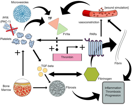 The “circulating wound” model. Clonal platelets and microvesicles generate an excessive release of tissue factor (TF), which occurs after tissue and vascular lesions. The triggering of the coagulation cascade results in an increased generation of thrombin, which acts as a protease and activates protease-activated receptors (PARs). PARs perform multiple functions: they rapidly convert functional fibrinogen into fibrin (by making the fibrinogen binding sites on platelets disappear, PFR), promote vasoconstriction, and ensure the platelets are activated. Signalling crosstalk with the TGF-beta pathway contributes to the genesis of inflammation and fibrosis.