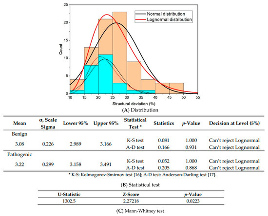 We first used the data generated from the wild-type (WT) alleles, known pathogenic and benign variants, as the trained data to set the cut-off value for the deleterious variants, by following the process described in detail in our previous publication [13]. Briefly, the density deviation of the 80 known pathogenic variants was plotted against the normal and lognormal distribution curves for Anderson-Darling and Kolmogorov-Smirnov goodness-of-fit tests [16,17] (Figure 1A,B). Here, “structural deviation” was defined as the Ramachandran plot difference between the pathogenic and the trained data, of which the trained data contained the average benign variants and WT Ramachandran density plots. A significant deviation with a mean of 3.22 was obtained, with a scale sigma of 0.299 and upper and lower 95% boundaries between 3.158 and 3.491. The lower 95% boundary of the mean was set as the cut-off for the variants with deviation ≥ 3.158 to be classified as “deleterious”, and those <3.158 were classified as the “undefined” (no structure change doesn’t rule out deleterious effects). The deviation number was converted to a percentage to show the deviation rate from the WT. The Mann-Whitney test showed that the benign and pathogenic data were significantly different, with a Z score of 2.27 and p-value of 0.0223 [18] (Figure 1C).
