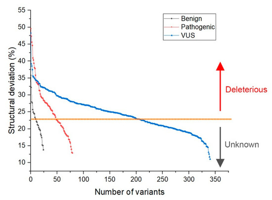 - Deviation distribution. The range of deviation was 3.158–3.878 (23.5–48.3%) (Figure 3). This range was similar to that of known pathogenic variants, except for the top 3—R273C, Y220C, R175H (49.6, 47.4, 45.6%)—as they were highly destructive for the TP53 structure (Figure 2). For benign variants, 6 out of 23 benign variants were above the deleterious structure limits (>23.5%). Here, the Q165K had a structure deviation of 35.7% and was an outlier within the benign variants. The variants below the cutoff line were classified as “unknown”, as certain pathogenic variants may have minimal impact on structure stability [19]; therefore, their overall structure scaffolds can be comparable to benign variants. Overall, the results justified the use of the deviation from known pathogenic variants as the reference to classify the missense VUS.