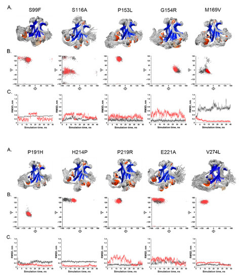 Figure 4. Spatial change of the substituted residues by missense VUS variants. (A) Superimposed variant protein structure; (B) Ramachandran scatter plot of the WT residue (black) and the substituted residue (red); (C) RMSD plot of the substituted residue (red) relative to the global protein structure. The substituted residues (red) fluctuated at different positions in comparison to the WT residues (black), implying the substituted residues caused different spatial coordination. See detailed description in Results. - Distribution in TP53 secondary structure. The deleterious VUS variants were distributed across the entire DNA binding domain, of which 44 were in the regions with few known pathogenic variants, including entire β sheets, loop 1 and loop 2, and all linkers; for the regions overlapped with the known pathogenic variants, the deleterious VUS variants were distributed more widely than the known pathogenic variants (Figure 5). The results indicate that RPMDS provides high sensitivity to detect deleterious missense VUS variants.