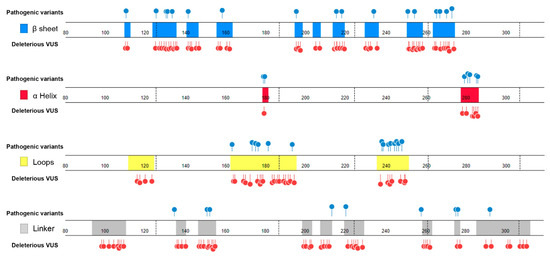 The ClinVar database periodically updates its classification for VUS variants based on new evidence. The 340 missense VUS variants used in our study were from the ClinVar database, accessed on 9 April 2020. By comparing the 340 missense VUS variants with the latest release of ClinVar VUS information, accessed on 17 May 2021, we identified 17 updated VUS classifications, of which 3 were re-classified as pathogenic and 14 as conflict interpretation (Table 1). The 3 VUS re-classified as pathogenic (c.695T>A, I232N; c.706TG, Y236D; c.794T>A, L265Q) were all classified as deleterious by our study; of the 14 VUS reclassified as conflict interpretation, 9 were classified as deleterious and 5 were classified as undefined by our study. The fact that RPMDS reached a similar classification for the 3 ClinVar re-classified VUS variants (I232N, Y236D, L265Q) demonstrates high specificity of RPMDS for deleterious variant classification. ClinVar re-classified 14 VUS as “conflict” implying that new deleterious evidence (although it may not be sufficient) had been accumulated for these VUS since their previous VUS classification. RPMDS provided structure-based evidence to support their deleterious effects.